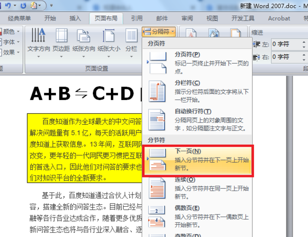 1、将光放在要设为横向的前一页的尾部,在页面布局单击分隔符,在打开的菜单中选择分节符,下一页;同样的方法在这一页的后面再插入一个分节符;