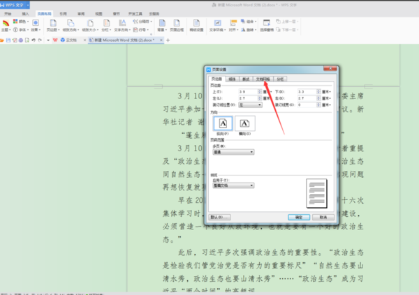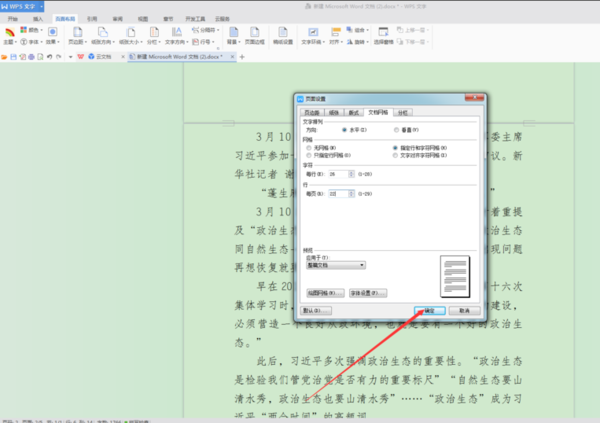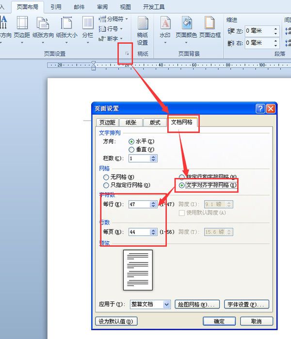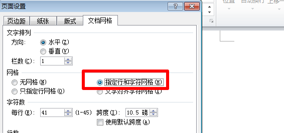打开页面设置对话框,文档网格选项卡。