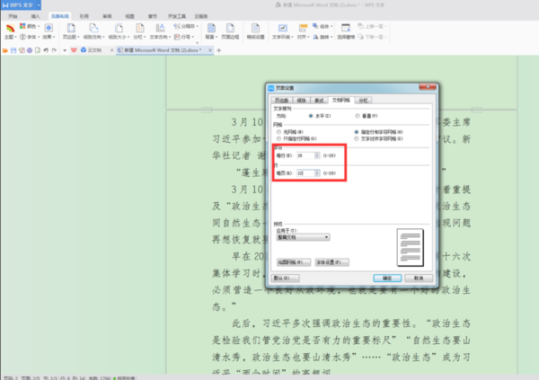 5、然后对“字符”和“行”中的数字进行修改,设置成自己需要的数字。正式的公文排版中,要求每页显示22行,每行26字(包含标点符号),以此为例了。