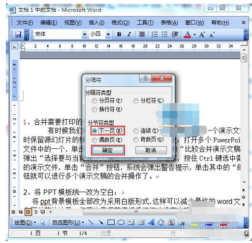 2、在“分隔符”中选择“分节符类型”的“下一页”并按“确定”。