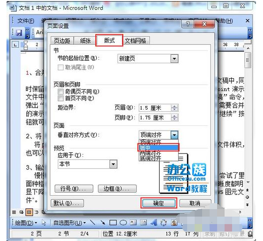 4、再“页面设置”内选择“版式”将“垂直对其方式”选为“居中”按“确定”即可。