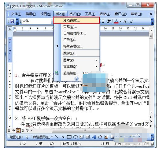 1、打开Word文档,点击“插入”→“分隔符”。