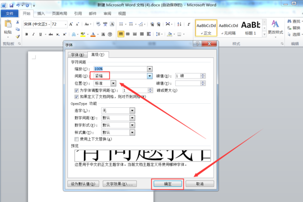2、在“高级”标签页中,字符间距选择“紧缩”,然后点击确定按钮即可。