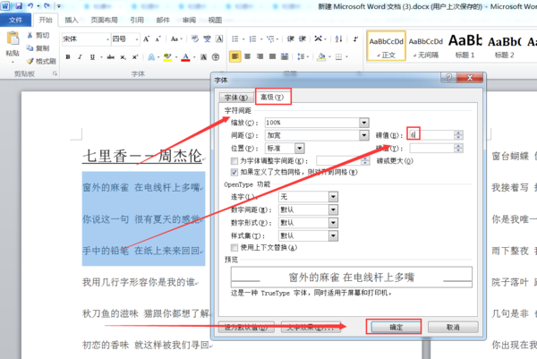 2、在高级标签栏中,字符间距后面“磅值”输入框中根据需求输入合适的数值(可多次修改直到满意),然后点击下面的“确定”按钮即可。