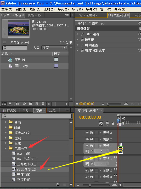 2.在视频特效中找到色彩校正,然后点开找到亮度与对比度,将亮度与对比度直接拉到轨道上的视频上。
