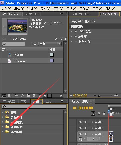 1.pr打开视频,点击左下方的效果,选择视频特效。