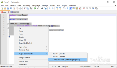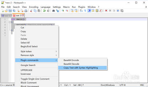 (1)选中Notepad++文本编辑区里的代码,鼠标右键点击选中区域,在弹出的菜单当中选择【Plugin commands】->【Copy Text with to Syntax Highlighting】。