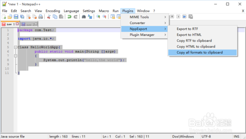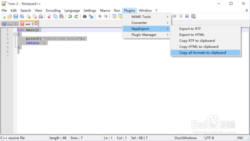 (2)选中Notepad++文本编辑区里的代码,进入【Plugins】菜单,进入【NppExport】,点击【Copy all formats to clipboard】。