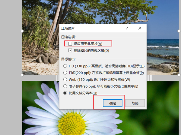 3.选中“选项”下面的“压缩图片(C)”和“删除图片的剪裁区域(E)”
