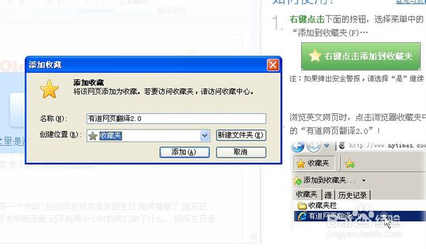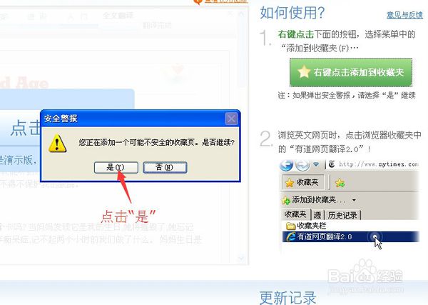 4、添加到收藏夹会有提示“您正在添加一个不安全的收藏页”,我们点击“是”;