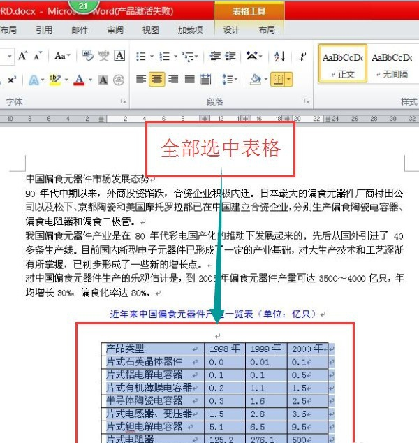 2、全部选中表格