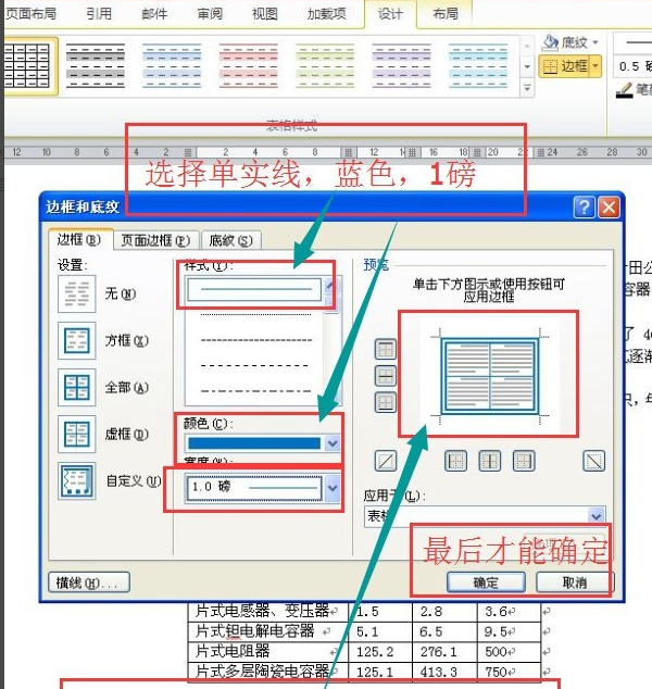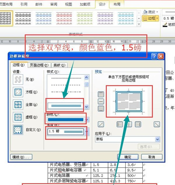 5、设置表格外框线为1.5磅蓝色(标准色)双窄线设置完成后不要点击确定等把内框线设置完成后才能点击确定。