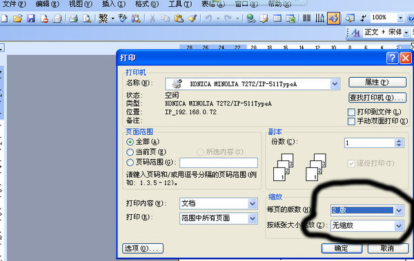 2、然后在弹出的对话框中选择【缩放】【每页的版数】后面选择需要的版数(你的文档有几页就选择几版)然后点击【确定】