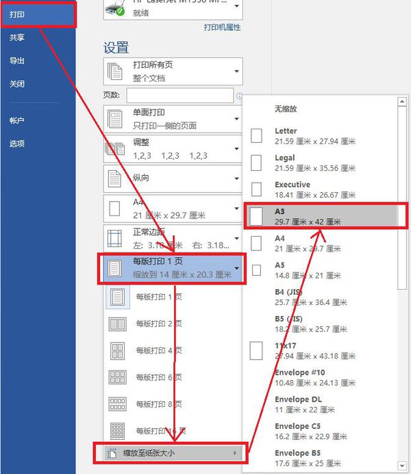 office2016只是改了下用户习惯而已,具体见上图“打印”——“每版打印1页”(这里选择每张几页的,和下面的缩放同时有效)——“缩放至纸张大小”,然后选择要打印到多大的纸张上即可。