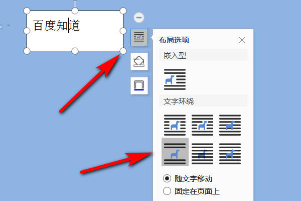 5、此时可以点击文本框右边的布局选项快捷工具,上下型环绕或者是四周型环绕。