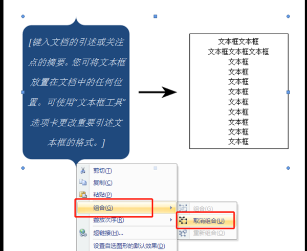 3、选中文本框组合后,鼠标右键点击并选择“组合”再接着选择“取消组合”选项。