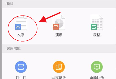 2、下载完毕后打开wps,准备新建word。点击页面最下面的“+”图标,进入新建页面。出现新建页面后,点击“文字”图标。