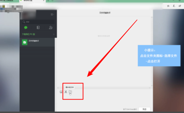 3、然后在聊天列表中可以看到“文件传输助手”,点击该图标,点击对话框上方的文件夹图标,选择需要发送的文件,点击打开即可。