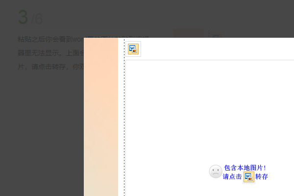 3、粘贴之后会看到word里的图片粘贴到编辑器里无法显示。上面会提示包含本地图片,点击转存选项。