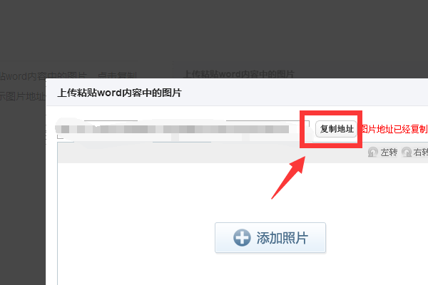 4、跳出上传粘贴word内容中的图片,点击复制地址,会显示图片地址已复制。