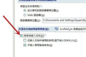 6、在出现的对话框中,勾选“将字体嵌入文件”前的方框(图中红色箭头所指),再点击“确定”(图中蓝色箭头所指)