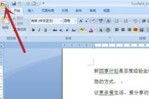 1、打开一个示例的文档,点击左上角的“Office 按钮”(图中红色箭头所指)