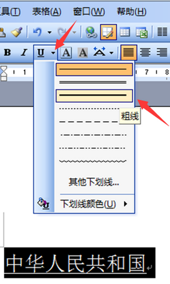 1、点击下划线符号右边的小箭头,出现下拉菜单,点击粗线;