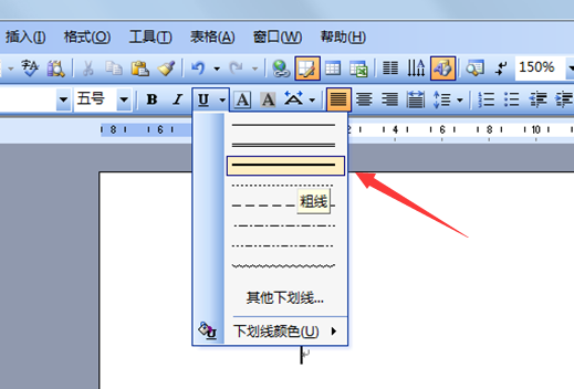 3、点击下划线符号右边的小箭头,下拉菜单中有众多不同的下划线,点击粗线;