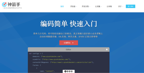 神箭手云爬虫是一个帮助JS开发者快速开发爬虫系统的SaaS服务平台。神箭手提供上手简单,灵活开放的云爬虫开发框架,让开发者只需要在线写几行js代码就可以实现一个爬虫。并且爬虫将自动运行在云服务器上,爬取速度更快,效率更高。