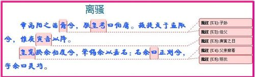 新建一张Word文档,在文档中输入屈原的离骚,现在来插入注释,选择需要注释的词语“裔”,单击插入——批注,出现编辑框,在编辑框中输入“子孙”,批注就出现了。如图: