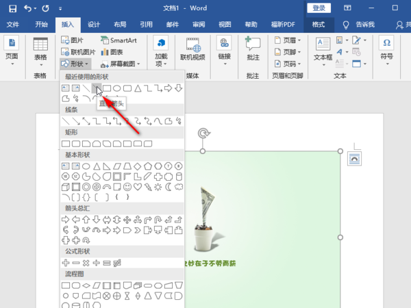 2、然后在菜单栏中点击选择插入菜单下的—形状并选择直线箭头形状。