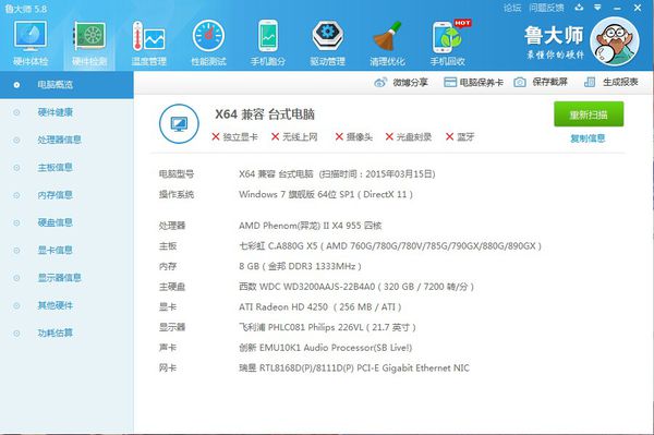 如“鲁大师”这款软件就可以自动检测电脑的硬件配置情况。