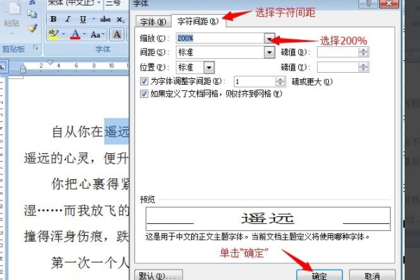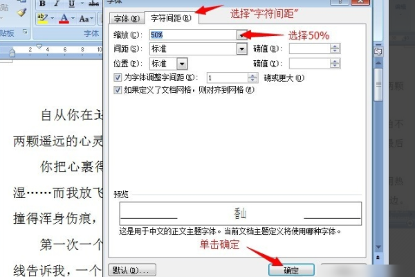 5、在字体设置里面选择字符间距,同样找到缩放选项,输入50%。
