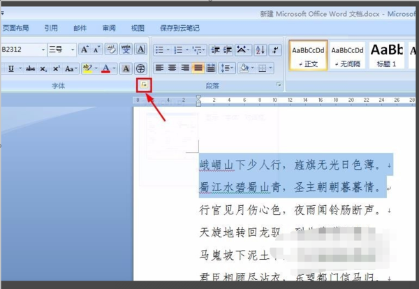 1、首先打开一份需要设置文字缩放的文档,选中需要设置的文字,在开始的选项卡中点击字体的对话框。