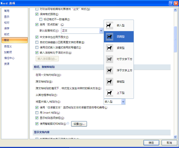 2、弹出Word选项对话框,单击高级---->剪切、复制和粘贴---->将图片插入/粘贴为后面的输入框,在弹出的选项中选择四周型,如图所示;(注:因默认为嵌入型,不能同时选中多个图片)