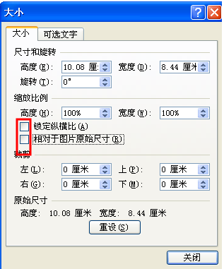 5、弹出大小对话框,选择大小选项卡,去掉锁定纵横比和相对原始图片大小复选框中的对勾,在高度、宽度输入框中输入所需要的数值即可,如图所示;