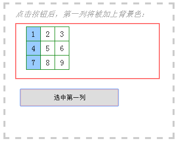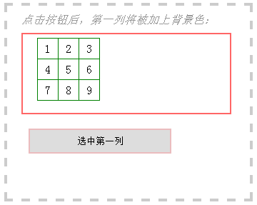 <divclass="box"> <span>点击按钮后,第一列将被加上背景色:</span><br>
