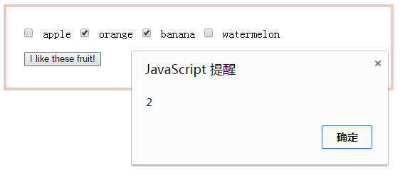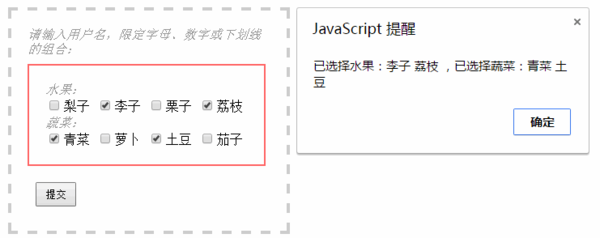 alert("已选择水果:"+fruit+",已选择蔬菜:"+vegetable);