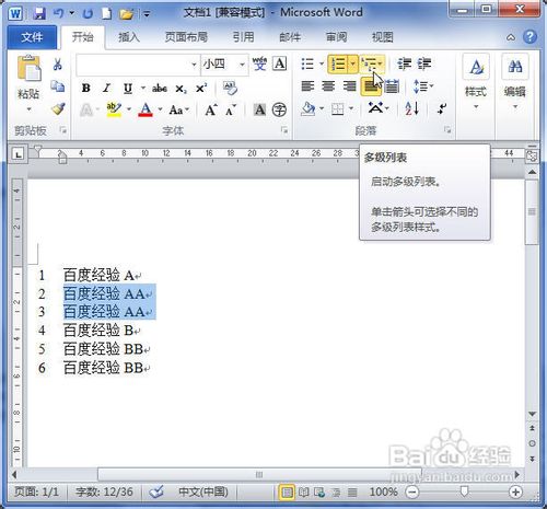 打开Word2010文档页面,在“段落”中单击“多级列表”按钮。