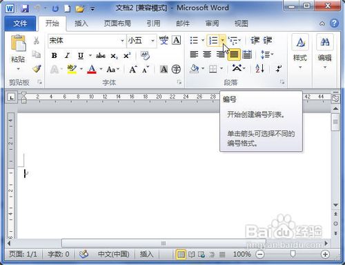 打开Word2010文档页面,在“段落”中单击“编号”下三角按钮。