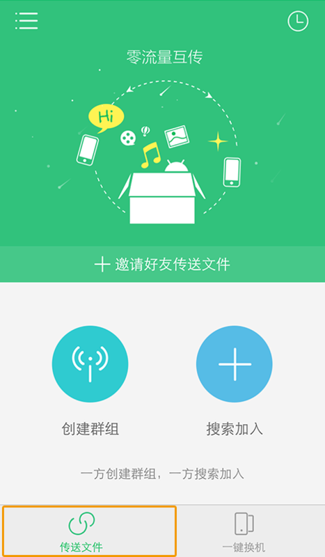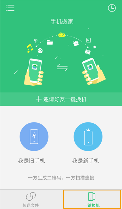 2、主界面默认在【传送文件】功能上,点击【一键换机】可以切换到一键换机功能。