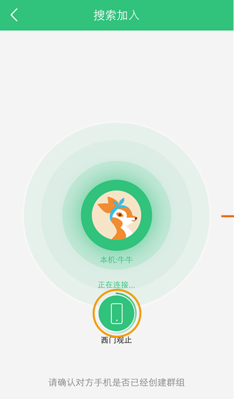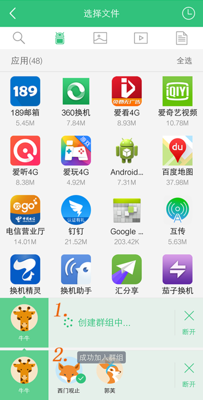 4、一方点击【我要发送】后,进入【选择文件】界面,界面下方自动创建群组,然后等待对方设备搜索成功后排列在下方。 第一个连接上的设备默认勾选的,方便向它文件,后面连接上的设备需手动勾选。