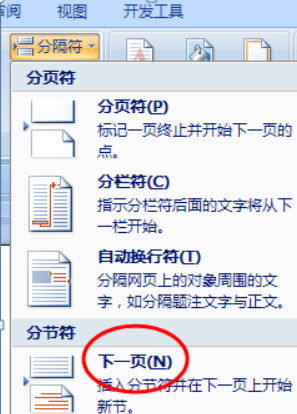 1、将光放在要设为横向的前一页的尾部,在页面布局单击分隔符,在打开的菜单中选择分节符,下一页;同样的方法在这一页的后面再插入一个分节符;