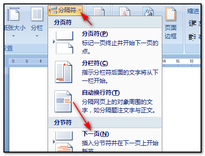 5、点击页面布局以后,在当前界面内找到并点击“分隔符”下拉选项中的“下一页”;