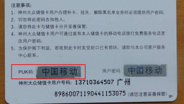 部分SIM卡的PUK码是用户在购卡时随卡附带的,如中国联通的手机卡卡套背后附有puk码,或中国移动的神州行等,而另一部分则需要向网络运营商索取。