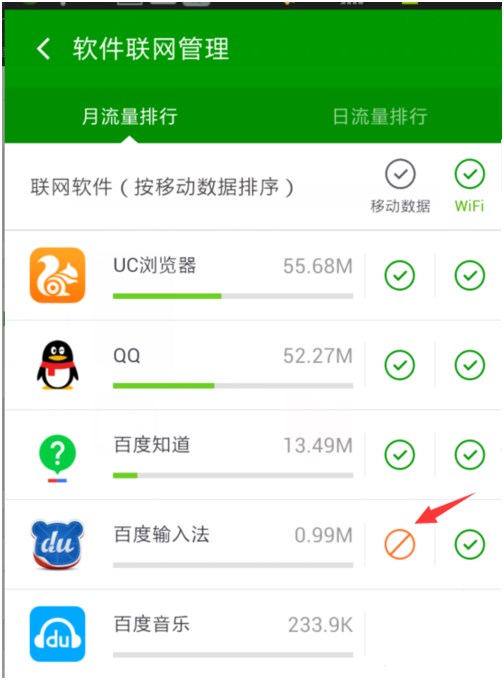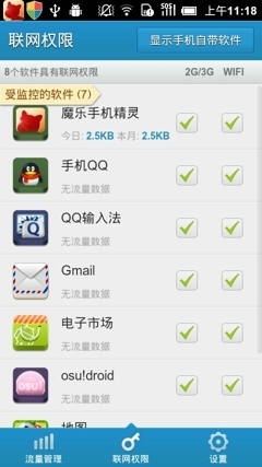 4、在权限管理中,把不必要上网的软件的移动网络连接的权限关掉即可。如图,把2G/3G下面的勾取掉即可。wifi可以不管,因为不费流量。