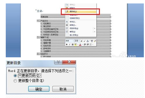 8.如果想要对目录进行更改的话,要注意回到目录右键点击【更新域】会弹出对话框【只更新页码】【更新整个目录】,根据需求进行更新。