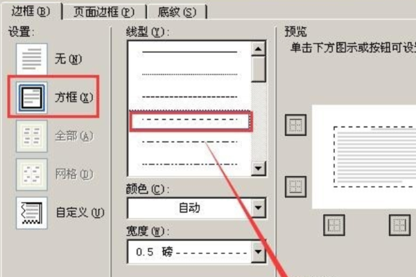 3、在出现的对话框中,选择左边的“方框”,中间“样式”的虚线,再按“确定”;