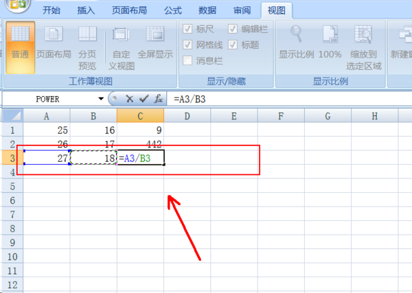 5、除法输入的公式为:【除数/被乘数】根据示例表格中的数据输入为【C3=A3/B3】
