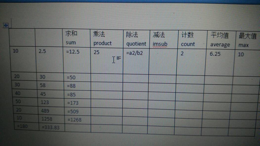插入公式域,修改域中的公式,与excel类似,用当前表格所在的行和列定位,如图中光标所在的公式为=a2/b2更多